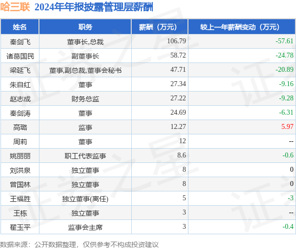 本站消息,哈三联发布2024年年报东莞股票配资平台,数据显示:公司主营收入11.32亿元,同比减4.58%。归母净利润为5867.52万元,同比减20.35%。扣非净利润为5323.34万元,同比增73.85%。当年公司员工总数2522人,同比增19.24%。人均薪酬11.49万元(注:"人均薪酬"根据定期报告中"应付职工薪酬"附注的本期增加值 / 员工总数计算而来),同比减10.28%。人均创收44.9万元,同比减19.98%。人均创利2.18万元,同比减34.21%。其中管理层薪酬总额为352.34万元,同比上一年减23.97%,薪酬最高的为董事长,总裁秦剑飞,薪酬106.79万元。