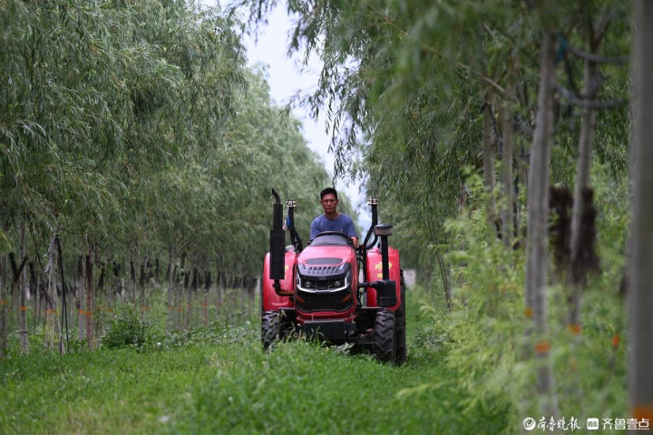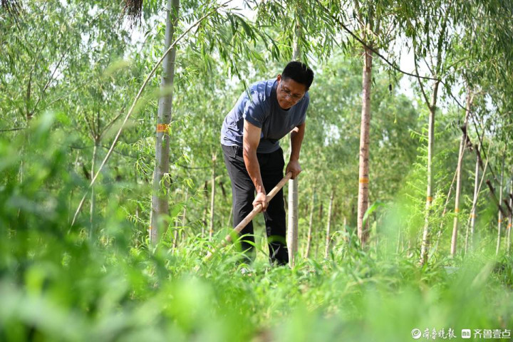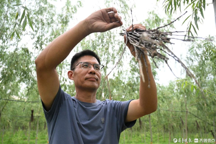 现在这片规整的金蝉养殖区,之前乱石遍地,杂草灌木丛生。2021年,孙钦国从老家带着虫卵枝,孤身一人来到章丘,用推土机将土地推平,改良土质,种上最适合金蝉生长的柳树品种,2022年开始投放第一批蝉苗,之后每年持续繁殖投放。