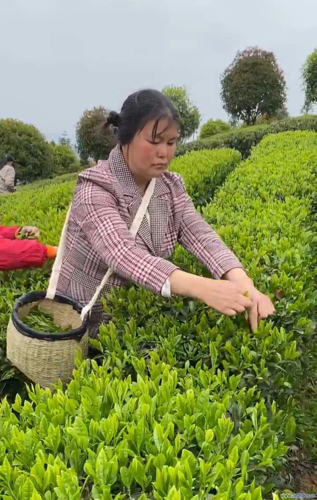 一位大哥在人群中穿梭,刹车、熄火,不等拔钥匙,便三下五除二地,将竹篓从摩托车上卸了下来。竹篓里满满装着的,是今天新采摘的嫩芽。他小跑进市场等开秤,鲜茶金贵,用“时间就是金钱”来形容毫不夸张。
